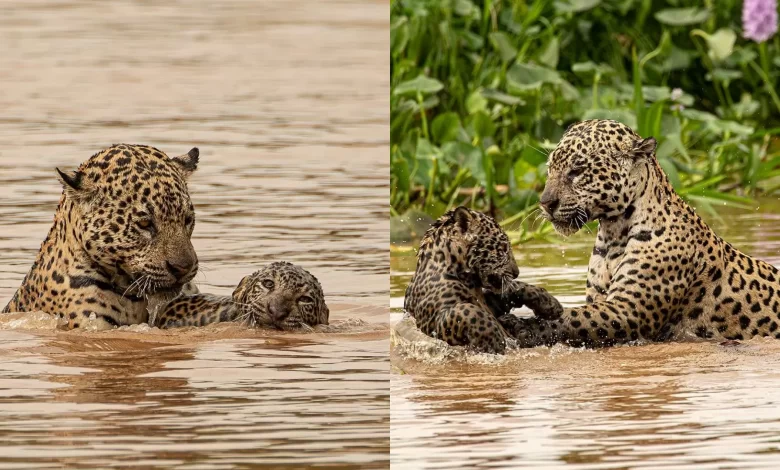 Juma e Maria Marruá? Imagens ‘alucinantes’ mostram onça ensinando filhote a nadar no Pantanal: ‘a última me matou’