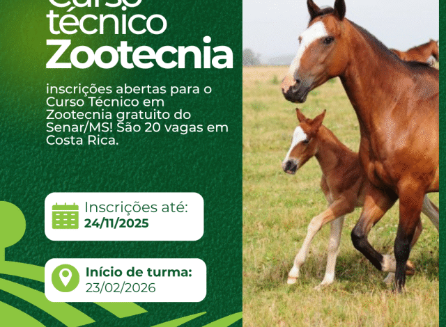 Estão abertas as inscrições para o Curso Técnico em Zootecnia, totalmente gratuito, oferecido pelo Senar/MS (Serviço Nacional de Aprendizagem Rural) em parceria com o Sindicato Rural de Costa Rica. O curso tem 20 vagas disponíveis e será realizado na modalidade semipresencial.