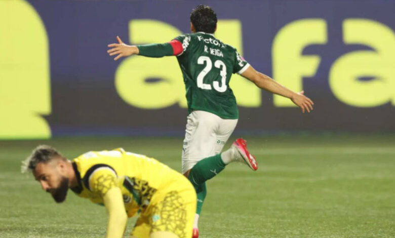 Na insistência, o placar foi aberto pelos palmeirenses. Felipe Anderson bateu, a bola desviou e sobrou para Raphael Veiga, que dominou e chutou para o gol.