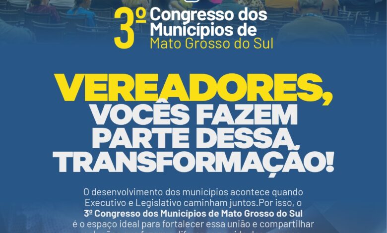 O 3º Congresso dos Municípios de Mato Grosso do Sul, que será realizado nos dias 20, 21 e 22 de outubro, no Bosque Expo, em Campo Grande, destaca o papel essencial dos vereadores e vereadoras na construção de políticas públicas eficientes e no fortalecimento do municipalismo.
