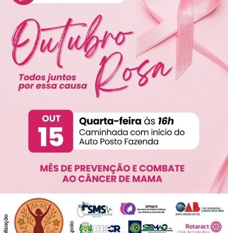 A cidade de Costa Rica realiza hoje, quarta-feira, dia 15, a Caminhada do Outubro Rosa 2025. O evento tem o objetivo de sensibilizar a população sobre a importância da prevenção e do diagnóstico precoce do câncer de mama.