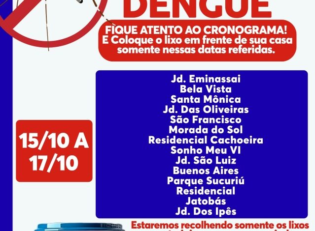 Os moradores são convocados a participar ativamente, colocando lixo e materiais inservíveis em frente às suas casas apenas nas datas programadas. A colaboração da comunidade é crucial para o sucesso da iniciativa e para reduzir a incidência de doenças transmitidas pelo Aedes aegypti, promovendo um ambiente mais seguro e saudável para todos.