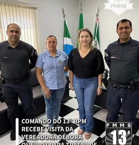 O Comando do 13º Batalhão de Polícia Militar (BPM) de Paranaíba recebeu, em 15 de outubro, a visita institucional da Vereadora Débora Queiróz para discutir políticas públicas de apoio ao Projeto Social da Patrulha Mirim, que funciona na sede da Unidade.