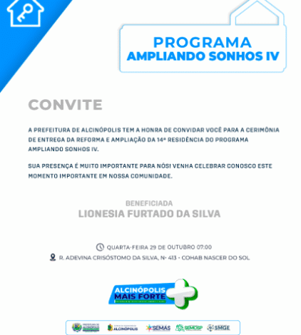 “É com grande alegria que convidamos você a participar deste momento especial, onde mais uma família de Alcinópolis verá seu sonho de uma casa reformada e ampliada se tornar realidade. Venha fazer parte dessa conquista e compartilhe a emoção conosco!”