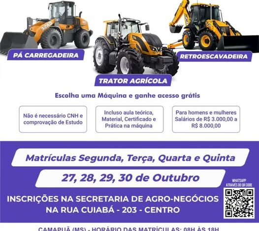 A MVB, em parceria com a Prefeitura de Camapuã, estará realizando entre os dias 27 e 30 de outubro o Curso de Operação de Máquinas Pesadas, com aulas práticas sobre: