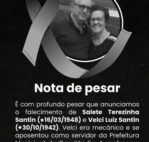 A Prefeitura de Cassilândia comunicou com profundo pesar o falecimento de Salete Terezinha Santim (nascida em 16/03/1948) e Velci Luiz Santim (nascido em 30/10/1942).