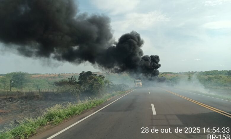 Uma carreta carregada com produtos químicos pegou fogo na tarde desta terça-feira, 28 de outubro, na BR-158, em um trecho conhecido como Pedreira, situado entre os municípios de Paranaíba e Aparecida do Taboado, em Mato Grosso do Sul.