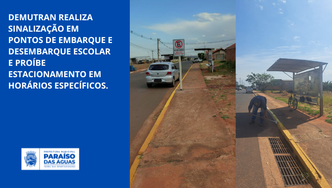 O Departamento Municipal de Trânsito (DEMUTRAN), com o apoio da Secretaria Municipal de Infraestrutura e Urbanismo (SEMIRU), realizou a implantação de nova sinalização horizontal e vertical em pontos de ônibus utilizados para o embarque e desembarque de alunos da rede escolar municipal.