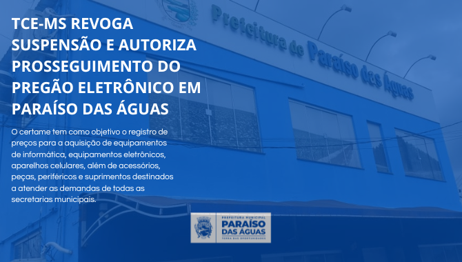 O Tribunal de Contas do Estado de Mato Grosso do Sul (TCE-MS) revogou a suspensão do Pregão Eletrônico nº 34/2025, instaurado pela Prefeitura Municipal de Paraíso das Águas. A decisão singular interlocutória permite que o certame prossiga.