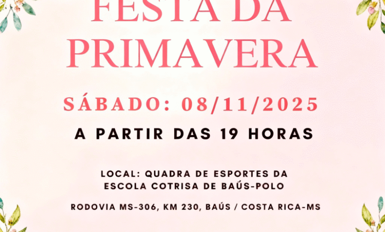 Escola Cotrisa do Baús, MS – Em uma das principais áreas produtoras do município (Rodovia MS-306, km 230), a união da comunidade escolar será colocada à prova, mas com um toque de celebração. A Escola Cotrisa de Baús realiza neste sábado, 8 de novembro de 2025, a partir das 19h, a sua 8ª Festa da Primavera. Mais do que um evento festivo, a noite é um motor de arrecadação de fundos vital para a infraestrutura da unidade.