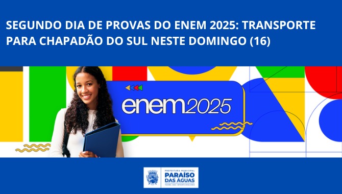 A Prefeitura de Paraíso das Águas, por meio da Secretaria Municipal de Educação, comunicou que irá disponibilizar transporte gratuito aos estudantes do município que farão as provas do Exame Nacional do Ensino Médio (ENEM) 2025. O transporte será oferecido neste domingo, 16 de novembro, para Chapadão do Sul, local das provas.