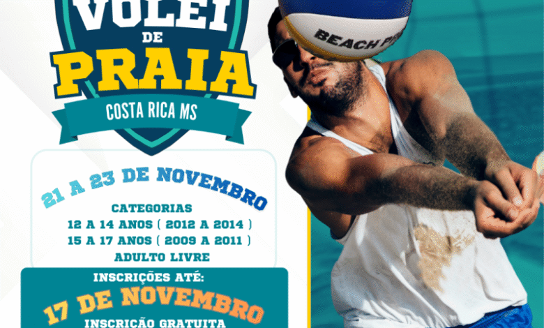 Costa Rica, MS – A Secretaria de Esporte e Cultura de Costa Rica anunciou a abertura das inscrições para a terceira edição do Torneio Municipal de Vôlei de Praia. O campeonato, que promove a prática esportiva e o trabalho em equipe, será realizado entre os dias 21 e 23 de novembro de 2025, no Parque Ecológico Vilibaldo Rodrigues Barbosa.