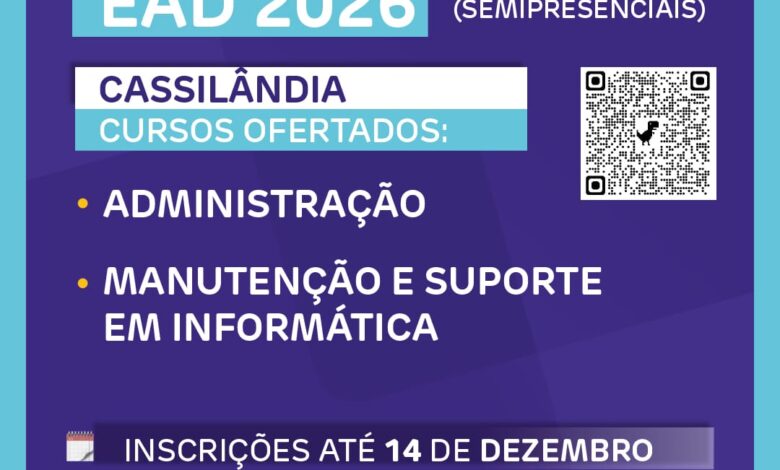 O Instituto Federal de Mato Grosso do Sul (IFMS) anunciou a abertura das inscrições para cursos técnicos semipresenciais (EAD) no Polo de Cassilândia. As vagas são destinadas a quem já concluiu o Ensino Médio e busca qualificação profissional gratuita para 2026.