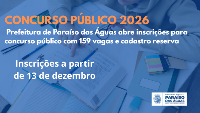 A Prefeitura de Paraíso das Águas publicou o edital de um novo Concurso Público que promete movimentar a região. São ofertadas 159 vagas imediatas, além de cadastro de reserva, com salários que variam de R$ 1.664,03 a impressionantes R$ 23.557,03.