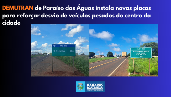 PARAÍSO DAS ÁGUAS/MS – Motoristas de veículos pesados que trafegam pela região devem ficar atentos à nova sinalização. O Departamento Municipal de Trânsito (DEMUTRAN) realizou, nesta semana, a instalação de placas indicativas estratégicas na BR-060. O objetivo é claro: retirar o fluxo de caminhões e carretas da área central e direcioná-lo para o Anel Viário.