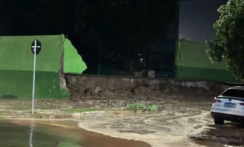 A força da água não poupou o patrimônio público. Na região central, a enxurrada pressionou e derrubou o muro dos fundos da Escola Estadual Sílvio Ferreira, localizada na Rua Viriato Bandeira. Lama, pedras e entulhos foram arrastados, evidenciando a violência da tempestade.