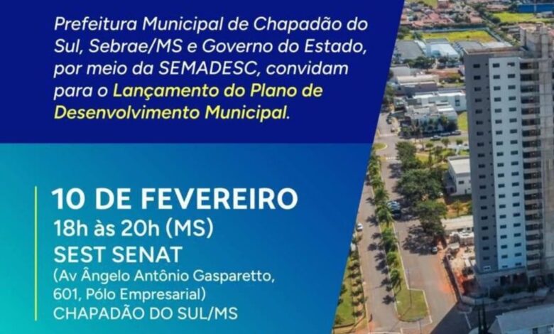 A Prefeitura de Chapadão do Sul, em parceria estratégica com o Sebrae/MS e a Semadesc (Governo do Estado), realiza no dia 10 de fevereiro (terça-feira) o lançamento oficial do Plano de Desenvolvimento Municipal. O evento ocorrerá das 18h às 20h, no SEST SENAT (Polo Empresarial).