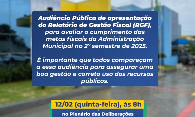 O que será mostrado: A equipe de Finanças da Prefeitura vai apresentar o RGF (Relatório de Gestão Fiscal) referente ao 2º semestre de 2025. Ou seja, é a prestação de contas de tudo o que entrou e saiu dos cofres públicos entre julho e dezembro do ano passado.