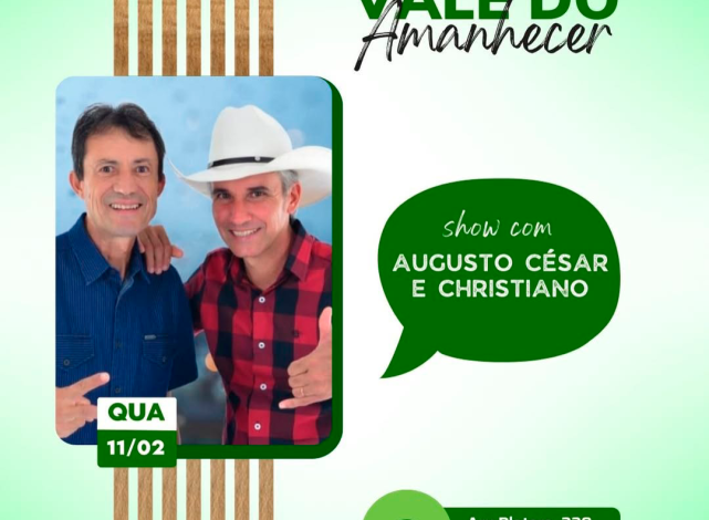 Atração Musical: Para animar a noite, tem show sertanejo com a dupla Augusto César & Christiano. O Secretário de Agricultura, Fernando Barbosa, reforça o convite: prestigiar a feira é colocar dinheiro no bolso do pequeno produtor local e levar saúde para a mesa de casa.