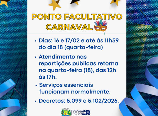 A decisão foi baseada em dois atos oficiais: o Decreto nº 5.099/2026, que já previa a folga nos dias 16 e 17 de fevereiro conforme o Calendário Oficial, e o Decreto nº 5.102, assinado nesta quarta-feira (11) pelo prefeito, que instituiu o ponto facultativo da quarta-feira até às 11h59. As publicações no Diário Oficial do Município oficializam as datas e garantem a organização dos serviços públicos para o período carnavalesco.