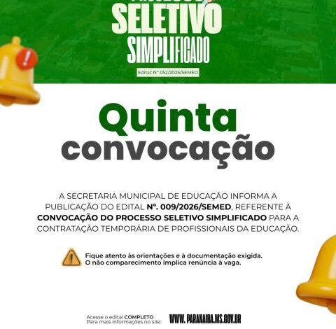 PARANAÍBA – A Secretaria Municipal de Educação (Semed) publicou, nesta quinta-feira (12), clique aqui: 009/2026/SEMED, que convoca candidatos classificados em Processo Seletivo Simplificado para a contratação temporária de profissionais. A medida visa suprir a demanda das unidades escolares da rede municipal para o ano letivo de 2026.