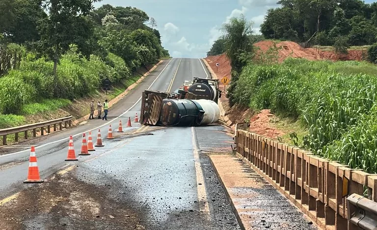 Acidente com carreta na BR-158 atingiu solo e curso d’água afluente do Rio Aporé, resultando em multa de R$ 74 mil à empresa transportadora