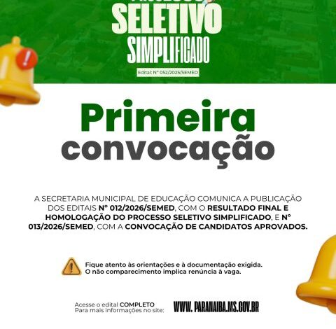 PARANAÍBA – A Secretaria Municipal de Educação (SEMED) deu o próximo passo para completar o quadro de funcionários da Rede Municipal de Ensino. Foi publicada a homologação do resultado final e a convocação dos candidatos aprovados no Processo Seletivo Simplificado para os cargos de Cozinheira e Monitor/Serviço de Apoio.