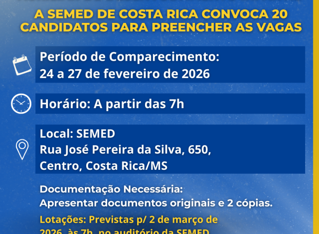 A Prefeitura de Costa Rica, sob a gestão Cleverson Alves e Roni Cota, publicou o Edital de Convocação nº 003/2026. A chamada é destinada aos aprovados no processo seletivo para o cargo de Auxiliar de Desenvolvimento Infantil, profissionais fundamentais para o suporte nas creches e escolas da rede municipal.