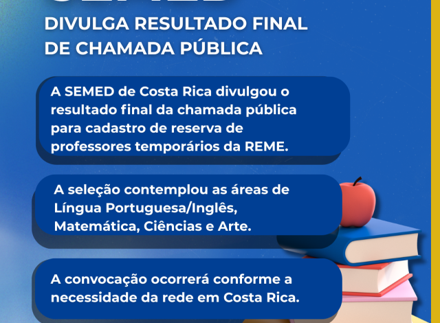 A Secretaria Municipal de Educação (SEMED) de Costa Rica oficializou, no último dia 13 de março de 2026, a homologação do resultado final da chamada pública para professores temporários. A medida visa garantir a continuidade das aulas na Rede Municipal de Ensino (REME) por meio da formação de um cadastro de reserva estratégico.