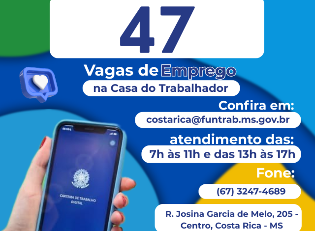 Mercado aquecido: Casa do Trabalhador de Costa Rica oferta 47 vagas de emprego nesta segunda