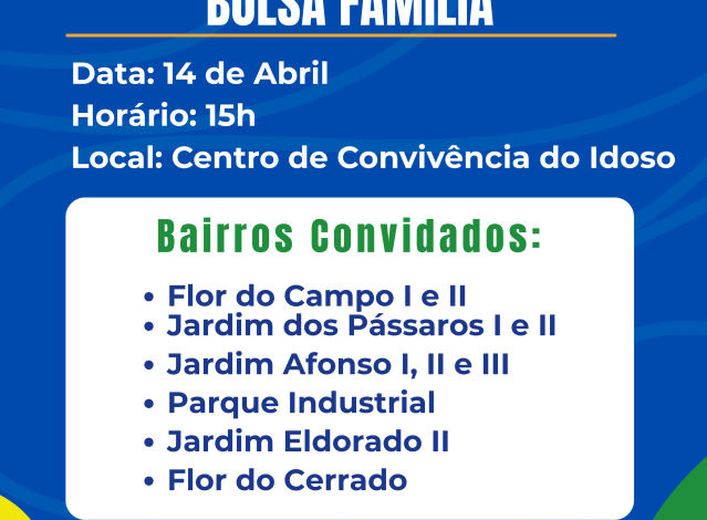 COSTA RICA (MS) – A Prefeitura de Costa Rica, por meio da Secretaria de Assistência Social e em conjunto com o CRAS, realiza na próxima terça-feira, 14 de abril de 2026, uma importante reunião socioeducativa para as famílias beneficiárias do Programa Bolsa Família. O encontro terá início às 15h (horário local) no Centro de Convivência do Idoso (CONVIVER), localizado no bairro Sonho Meu II.