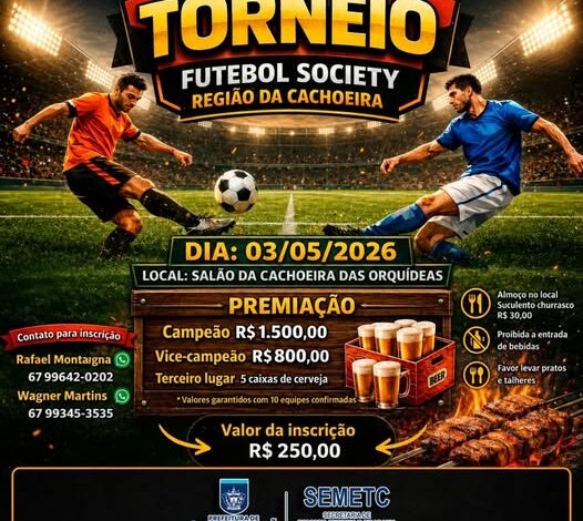 O esporte e a confraternização vão movimentar a zona rural de Camapuã no próximo domingo, 3 de maio. A Prefeitura Municipal apoia a realização do Torneio de Futebol Society – Região da Cachoeira, que promete reunir equipes de toda a região para um dia de competição e lazer no Salão da Cachoeira das Orquídeas.