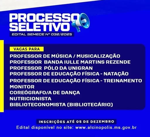 Leia maisMsEspecial O município de Alcinópolis está com as inscrições abertas para o processo seletivo (EDITAL SEMECE Nº 032/2025) destinado à…