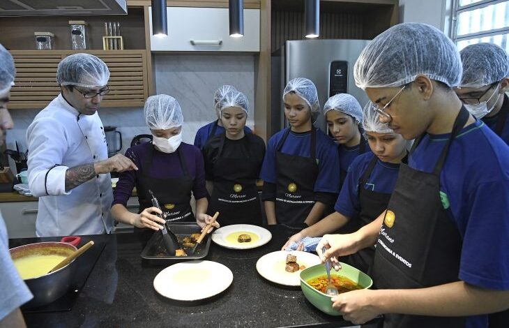 Os alunos do 1° e 2° ano do Ensino Médio desfrutam de um ambiente preparado para receber aulas teóricas e práticas de gastronomia. Aprendem pratos regionais, nacionais e internacionais. Cada aula tem 50 minutos e os jovens colocam a mão na massa. Os pratos inclusive são avaliados no estilo “Master Chef” pelos professores.